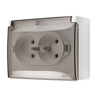 Paviršinis kištukinis lizdas, dvigubas kompaktas su įžeminimu, permatomas atvartas, IP44, Σ16A, 250V, varžtiniai gnybtai; baltas